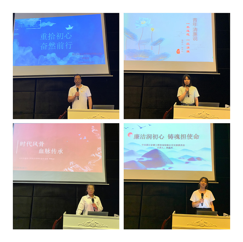 由中共金华市建设工程招投标与造价管理站党支部发起的第四期青年“清廉说”娓娓开始。我司青年党员乔金龙和其他三个支部的3位青年党员以《 重拾初心 奋然前行》、《一茎莲花 一品清廉》、《时代风骨 血脉相传》、《廉洁润初心 铸魂担使命》为主题作清廉宣讲。他们以一个个时代廉洁榜样故事 ,诉说着自己的个人清廉观点,共勉于我们每位时代新青年。